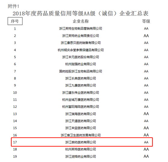 近日,浙江省藥監(jiān)局發(fā)布了《2018年度浙江省藥品質(zhì)量信用誠(chéng)信和嚴(yán)重失信藥品批發(fā)企業(yè)公示》,浙江朗佑醫(yī)藥有限公司榜上有名,榮獲“2018年度浙江省藥品質(zhì)量信用等級(jí)AA級(jí)(誠(chéng)信)企業(yè)”稱號(hào)。